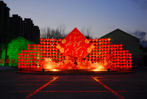 With coming of Dec. 23rd of Chinese lunar year, the Spring Festival atmosphere becomes much thicker. In no exception Shenyang Chemical Co. Ltd. set up a 20.4 meters long 7.5 meters high lantern combination standing on the eastern gate square, which consist of large Chinese characters "Fu" and red lanterns. In the darkness night they shine up with glitz and glamour and have became one of most splendor sceneries in Tiexi District.